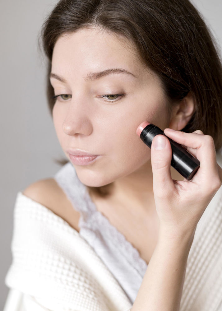 این کار وقتی که میخواهید رژگونه پر رنگ را برای آرایش مینیمال استفاده کنید، میتواند فینیش حرفهای به کار شما بدهد. این رژگونه پس از اعمال روی پوست کمی زمان نیاز دارد که با گرمای صورت واکنش نشان داده و ذوب شود. به همین دلیل اعمال آن با دست سریع است. اگر تازه کار هستید و میخواهید نتیجه کار حرفهای باشد، استفاده از براش مناسب را پیشنهاد میکنیم. در پایان از پودر تثبیت کننده یا اسپری تثبیت کننده آرایش استفاده میکنید.